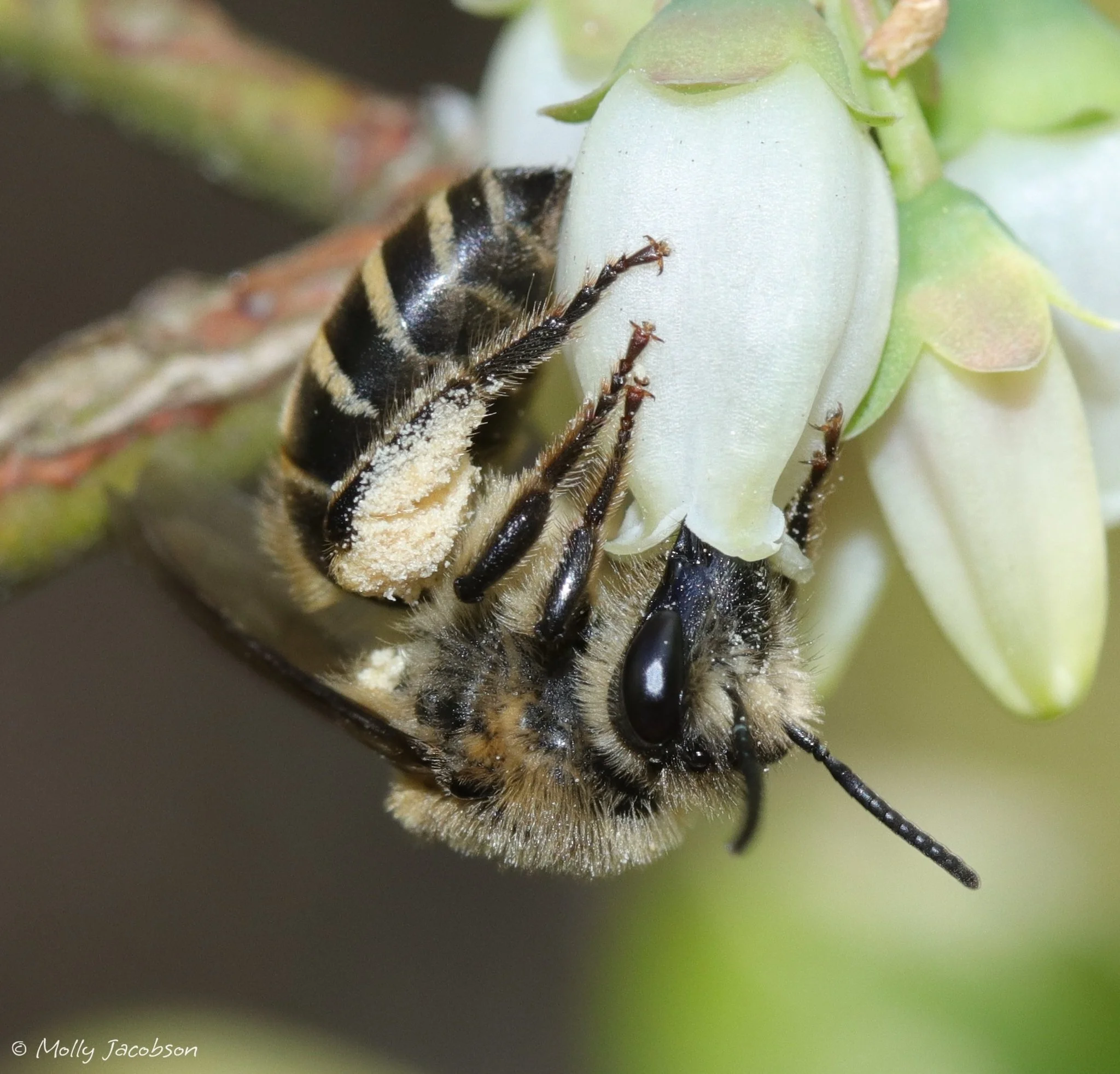Our logo features the cellophane blueberry bee (Colletes validus) perched on blueberry blossoms in a basket of blueberries. The cellophane blueberry bee is a solitary specialist bee that is native to the northeastern United States, including New Jersey. (Although we are now based in Queens, NY, we were born in Jersey!) It has a preference for foraging on blueberry plants (NJ’s state fruit that is also native to the area) but will forage on other berry plants as well.