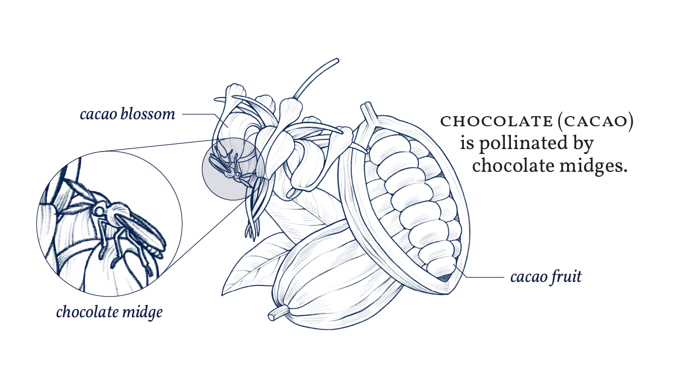 Key ingredients in all of our baked goods benefit greatly from pollinators! Chocolate is made from the dried, fermented seeds of cacao fruits which grow on the cacao tree, Theobroma cacao. The flowers of the cacao tree are tiny and complex and need tiny pollinators to transfer their pollen so they can produce fruit. That’s where chocolate midges come in! Tiny flies in the family Ceratopogonidae, including the genus Forcipomyia, are known to be important pollinators of cacao. Other types of tiny flies, wasps, and ants have also been observed visiting cacao flowers, but more evidence is needed to know if they are successfully pollinating.