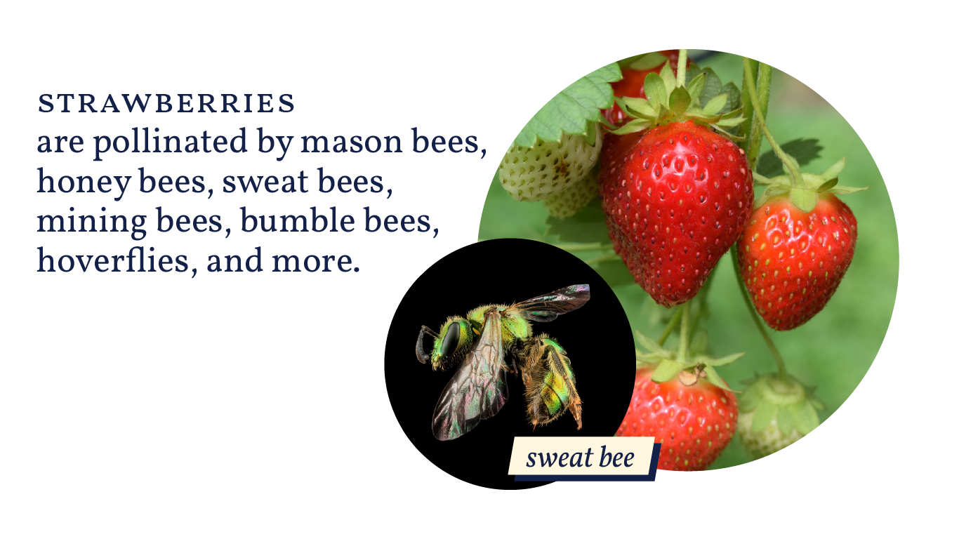 Key ingredients in all of our baked goods benefit greatly from pollinators! While strawberry plants are self-fertile, the addition of insect pollination can result in larger and higher quality fruit. Commercial honey bees may be used to help commercial crops, but studies have found that wild bees such as the red mason bee (Osmia bicornis) in Europe are even more effective. Sweat bees, ground-nesting bees in the family Andrenidae, bumble bees, and syrphid flies have also been observed visiting strawberry flowers.